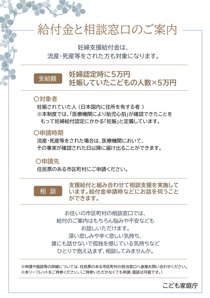 2025年4月1日より、こども家庭庁の施策として「妊婦のための支援給付」制度が開始されます。流産、死産、人工妊娠中絶を経験された方も申請が可能です。